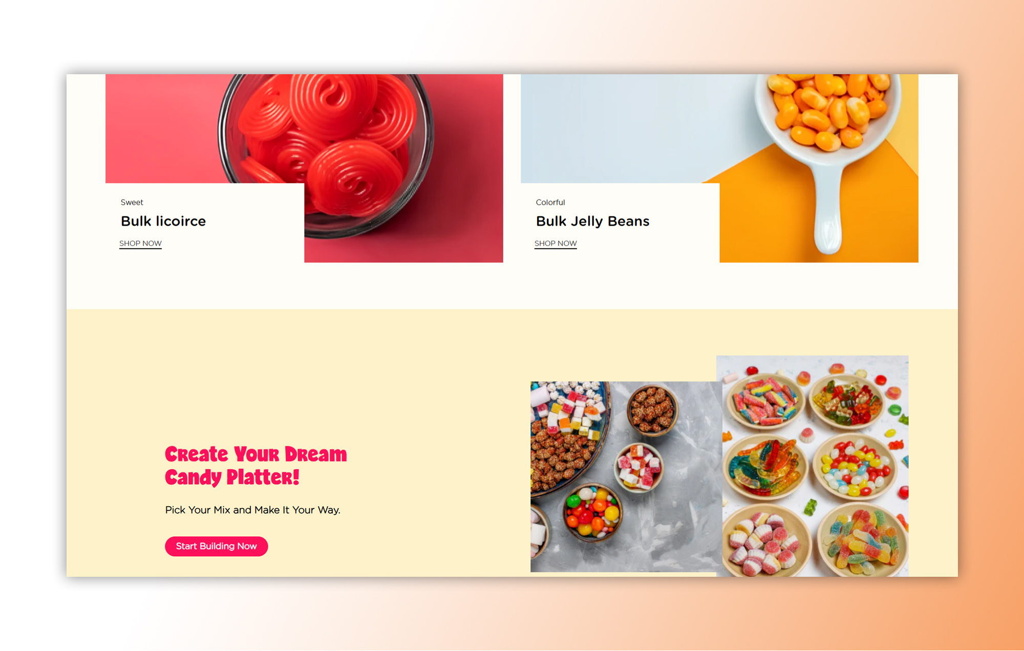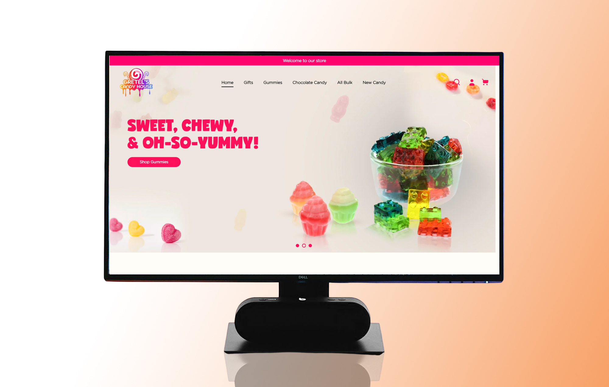 The design captures the whimsical charm of a candy-filled house, blending vibrant visuals with seamless shopping.